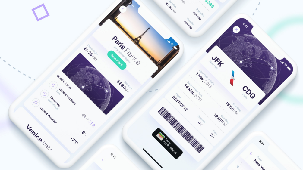 Screens of Flights App: home (4 Versions), card view, calendar, profile, options, Tickets View, summary, apple pay, checkout, and more...