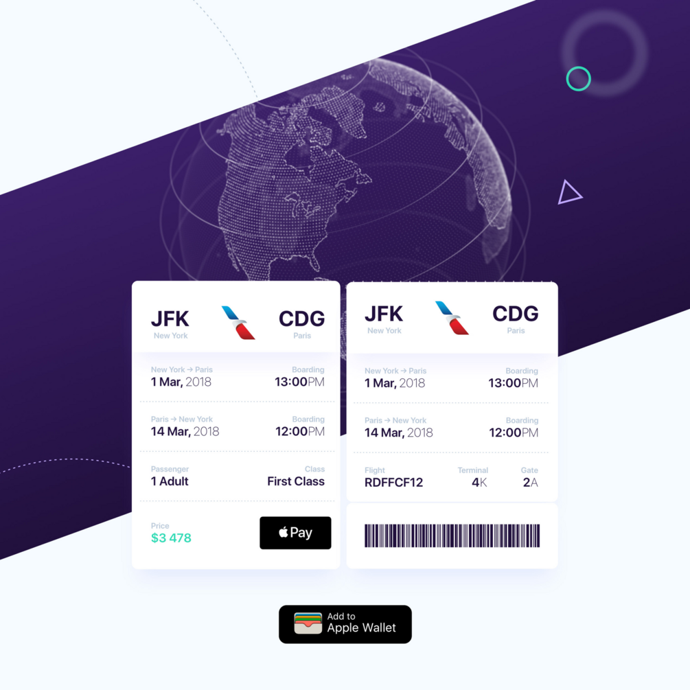 Screens of Flights App: home (4 Versions), card view, calendar, profile, options, Tickets View, summary, apple pay, checkout, and more...