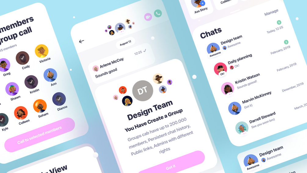 Screens of Clean Chat App:, Profile, Message window, Home screen, Group chat, Single chat, Reply, Forward, Message create, and more...