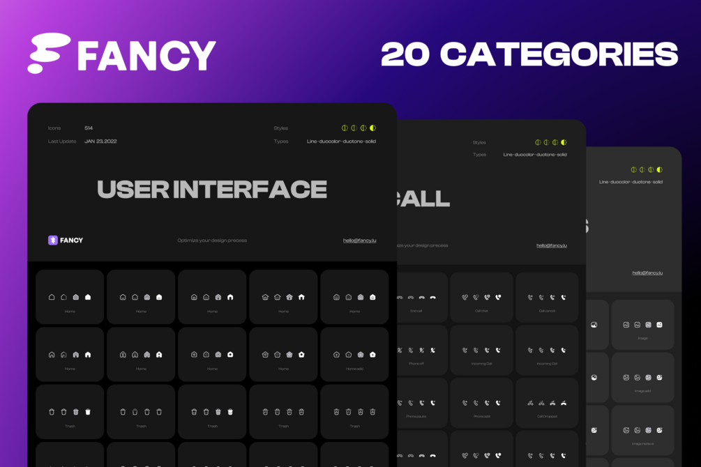 Fancy is created to improve your design and speed up your work. Pixel-perfect icons in 4 styles (Line, Solid, Duotone and Monochrome) and 2 modes (Light and Dark) are suitable for any design and will help to make it cleaner and neater.